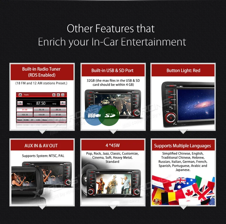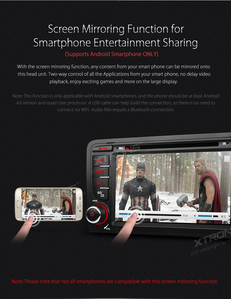 XTRONS7" HD Digital Touch Screen Dual CANbus GPS Navigator Car DVD Player with Screen Mirroring Function for Audi A3 / S3 / RS3 *Processor:Cortex A7,CPU:800M *Refreshing User Interface *High Transmittance & Anti-dazzle Touch Screen *Screen Mirroring Function * 7"HD Touch Screen *Dual Channel CANbus *Region Free DVD Player *Phonebook Transfer Contacts information Search *Efficient Heat Dissipation *Optional Accessories to perfect your user Experience •Applicable Models & Years Audi A3 8P (2003-2012), A3 8P1 3-door Hatchback (2003-2012). S3 8P (2006-2012), RS3 Sportback (2011-2012) Face Panel: (Top: 240*Bottom:230)*125mm Although we have made every effort to ensure this unit will be compatible with the listed vehicles, please check the year, dimensions and shape of the center console of your vehicles before purchasing. IMPORTANT NOTE: 1. Please check whether your vehicles' original CD is single din size, it if is, this unit can NOT fit with your car. 2. Please check your vehicles' radio antenna port, you may need to order a radio adapter cable to aid for the installation. (XTRONS ICE/ACS/13-012 is compatible) 3. This head unit is compatible with your car's original BOSE system; you just have to connect the amplifier control cable in the ISO wiring harness with the amplifier control cable in the RCA cable. 4. Please note that if your vehicle has no BOSE system, but it has the audio port, you need to ask for a professional technician to make some modifications of the wires connection; otherwise, your rear amplifier speakers will NOT have sound. 5. Please check to see whether there is RNS-D (Radio Navigation System) or BNS 5.x (Basic Navigation System), if there is, this unit is NOT compatible with your car. •Refreshing User Interface Specially Designed for your Audi Vehicles The original User Interface and classic appearance retaining all the stylish and unfailing elements Audi has. Same appearance provides different entertainment solution. •High Transmittance & Anti-dazzle touch screen PF71A3AS with high transmittance & anti-dazzle Touch Screen gives you Ultrahigh light transmittance, clear and vivid images. Other aftermarket units with ordinary touch screen have low light transmittance and fuzzy images. •Screen Mirroring Function for Smartphone Entertainment Sharing(Supports Android Smartphone ONLY) With the screen mirroring function, any content from your smart phone can be mirrored onto this head unit. Two-way control of all the Applications from your smart phone, no delay video playback, enjoy exciting games and more on the large display. Note: This function is only applicable with Android smartphones, and the phone should be at least Android 4.0 version and quad core processor, A USB cable can help build the connection, so there is no need to connect via WiFi, Audio files require a Bluetooth connection. Note: Please note that not all smartphones are compatible with this screen mirroring function. •Dual Channel CANbus PF71A3AS Working Status can be Reflected on Your Car The dual channel CANbus is designed as a perfect fitting for Audi A3 / S3, it builds a close relationship between this unit and your car. PF71A3AS's current working mode information which includes Radio, Navigation, DVD can be displayed on your car's dashboard's display. •Quicker & Smoother Now with our powerful 800MHZ Cortex A7 Processor and latest WinCE6.0 system, you can enjoy the fastest running speed than ever. Processor: Cortex A7, CPU: 800M Navigation & Entertainment Faster GPS Navigation Get to your destination quickly and easily. Built-in Dual ZonePlay DVD / Radio / Music while navigating. Passengers in the back can also enjoy the entertainment. •Phonebook Transfer, Contacts Information Search Access phonebook, call logs, search contacts information with name or numbers, make hands free calls, display unanswered calls, custom pairing code and listen to Bluetooth music. Hands free calling Search contacts information by name or number Bluetooth music •Efficient Heat Dissipation Thickened heat sink enables the unit exhaust the additional heat quickly. Frosted Metal Material: Rust-proof and scratch-resistant, durable and luxurious. •7" HD Touch Screen 7" screen with incredibly high pixel density of 800*480 HD resolution provides amazing, vibrant video and visual effects. •Region Free DVD Player The DVD player is compatible with most DVD and CD discs that are available on the market. Compatible Formats: CD-Audio, CD-Video, CD-ROM, DVD-Audio, DVD-Video, DVD-ROM, CD-R, CD-RW, DVD-R, DVD+R, DVD+RW, DVD-RAM, Double layer DVD+R •External Accessories to Perfect Your User Experience External accessories to make the head unit better suited to your needs. 1. External Microphone (Optional) for more clarity and subdued background noise. (XTRONS MIC001 & MIC002 are compatible) 2. Reversing Camera (Optional) ensures the safe reversing. Supports NTSC / PAL signal input XTRONS Reversing Camera Series are compatible •Other Features that Enrich your In-Car Entertainment 1. Built-in Radio Tuner (RDS Enabled) (18 FM and 12 AM stations Preset) 2. Built-in USB & SD Slot 32GB (the max files in the USB & SD card should be within 4GB) 3. AUX IN & AV OUT Supports System: NTSC, PAL 4. 4 *45W Pop, Rock, Jazz, Classic, Customize, Cinema, Soft, Heavy Metal, Standard 5. Button Light Red 6. Supports Multiple Languages Simplified Chinese, English, Traditional Chinese, Hebrew, Russian, Italian, German, French, Spanish, Portuguese, Arabic and Japanese. •Size: Head Unit: 160*179*100 mm Face Panel: Top - 240 Below - 230*125*20mm •Accessories: 2 x ISO Wiring Harness 1 x USB Adapter Cable (Front) 1 x User Manual 1 x Radio Adapter Cable 1 x GPS Antenna 1 x RCA Cable 1 x USB Cable (Rear) 1 x CANbus Box --------------------------------------------------------------------------- We only offer map card for these countries: Austria, Albania, Andorra, Belgium, Bosnia Herzegovina, Bulgarian,Croatian,Czech, Denmark,Estonia,Finland, Fra